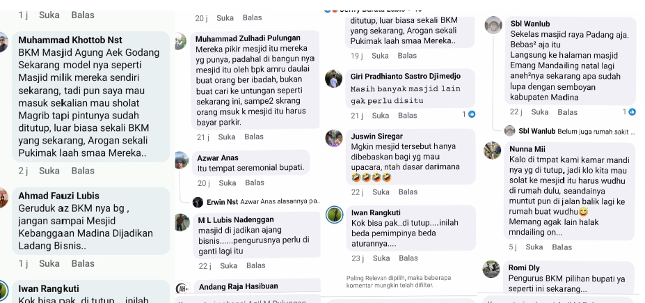 “BKM Masjid Agung Aek Godang sekarang modelnya seperti masjid milik mereka sendiri. Tadi saya mau masuk sekalian mau sholat Maghrib, tapi pintunya sudah ditutup. Luar biasa sekali BKM yang sekarang, arogan sekali,” tulisnya.